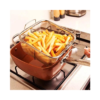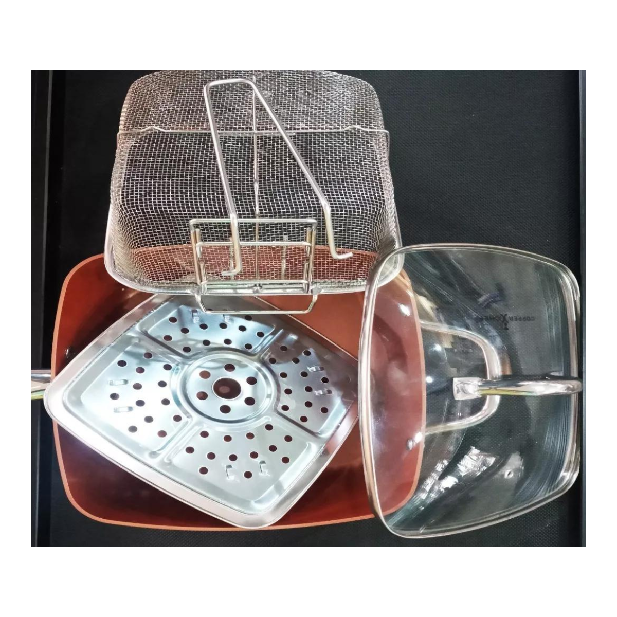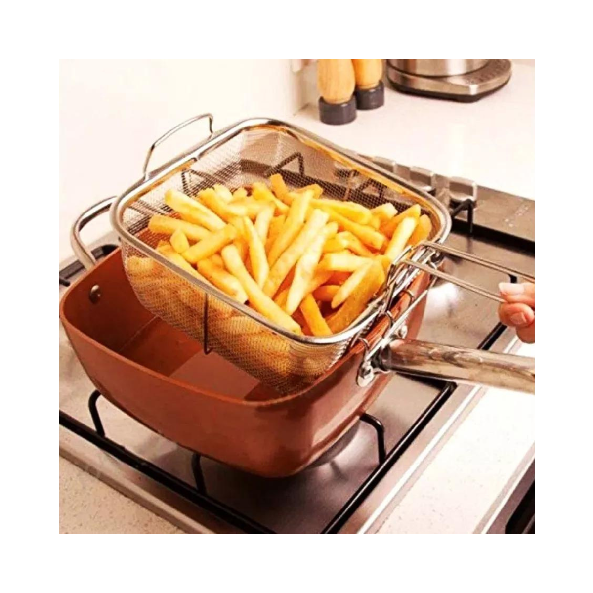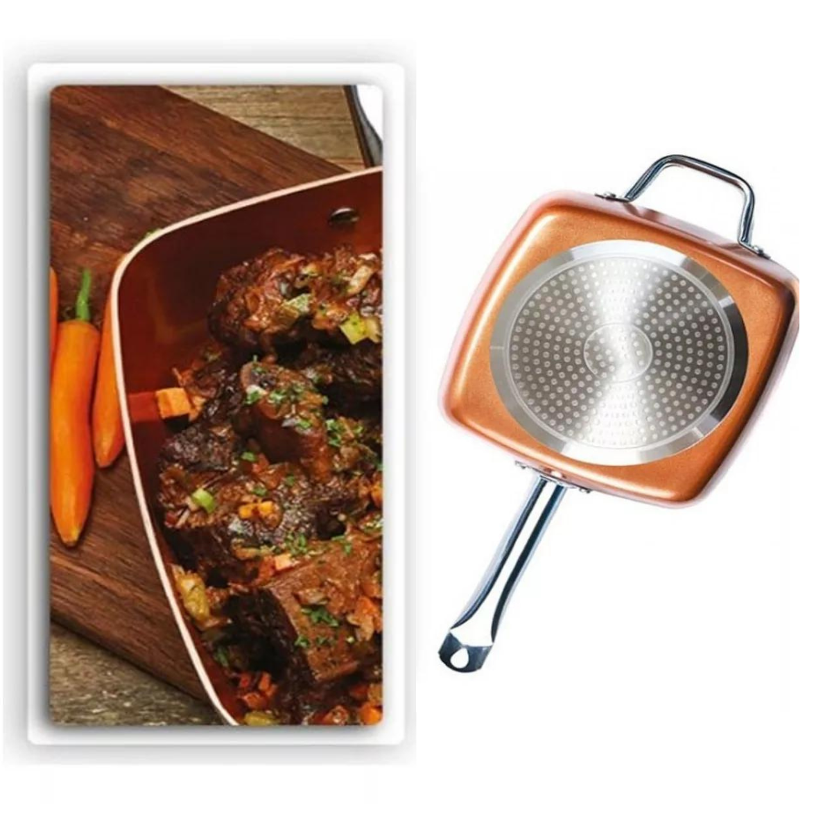Descubre la revolucionaria forma de cocinar con nuestro Sart n Freidora Multiuso Antiadherentes Dise ado para mejorar tu experiencia en la cocina este conjunto de sartenes cuadradas ofrece beneficios nicos para una amplia variedad de platos Cambia la manera en que cocinas y disfruta de resultados excepcionales Asas con Remaches Dobles Dise adas para brindar comodidad y seguridad las asas de nuestras sartenes cuentan con remaches dobles que aseguran un agarre firme durante la manipulaci n Resiste Altas Temperaturas Prepara platos a altas temperaturas con confianza Nuestras sartenes est n dise adas para resistir el calor proporcionando un rendimiento excepcional incluso en condiciones exigentes Calienta de Manera Uniforme Experimenta una distribuci n uniforme del calor que garantiza una cocci n eficiente No m s puntos calientes ni reas fr as cada rinc n de la sart n proporciona resultados consistentes Dise o Cuadrado Aprovecha hasta un 25 m s de espacio de cocci n gracias al dise o cuadrado de nuestras sartenes Obt n mayor capacidad sin comprometer la eficiencia ni la calidad de la cocci n Incluye Copper Chef1 Tapa de Vidrio1 Canastilla FreidoraRejilla para Cocinar al VaporRecetario